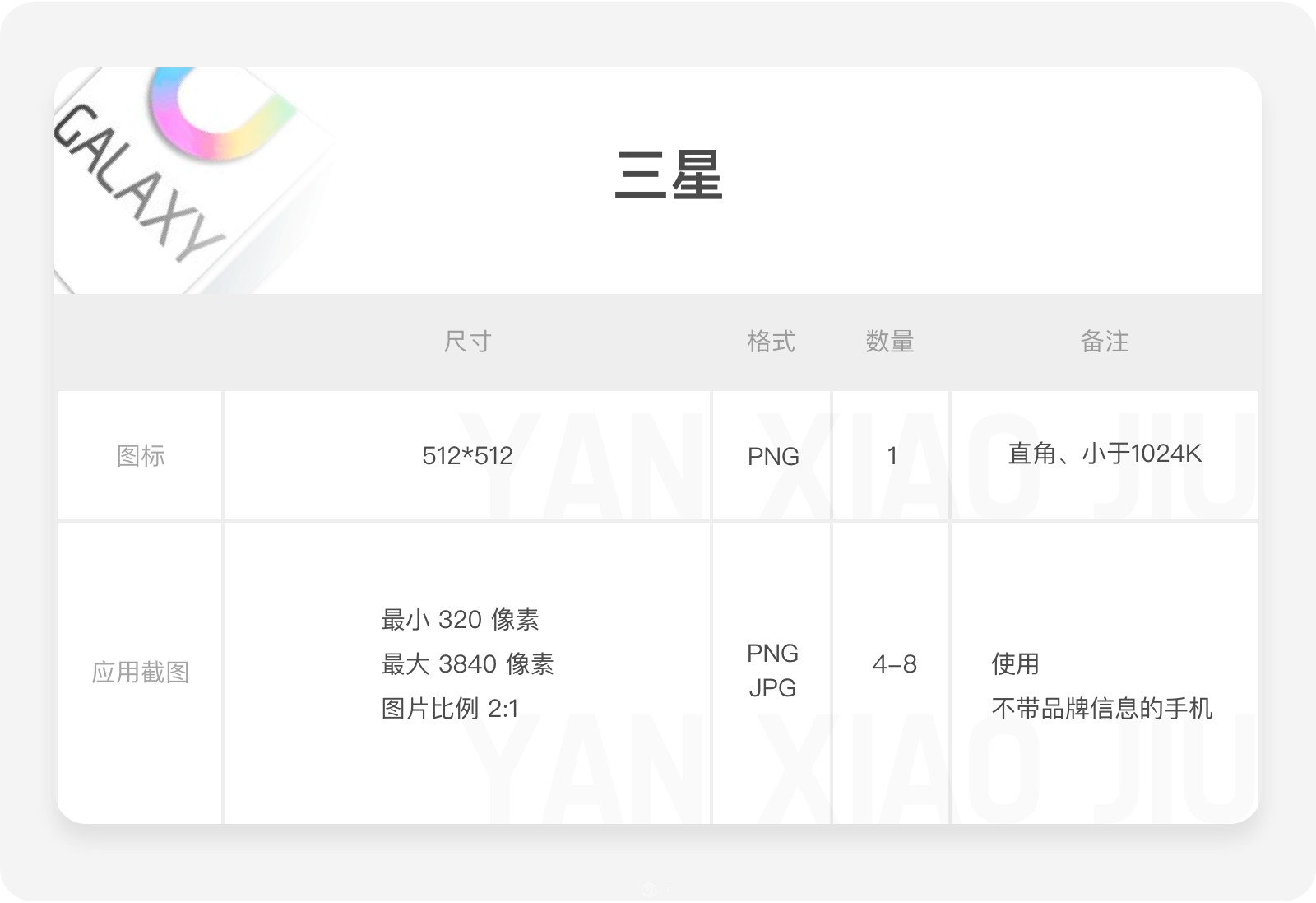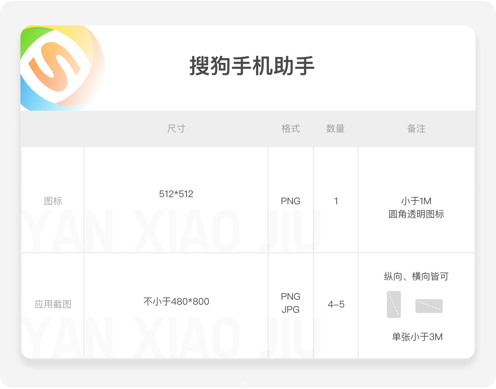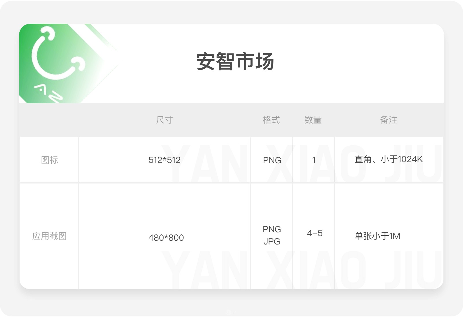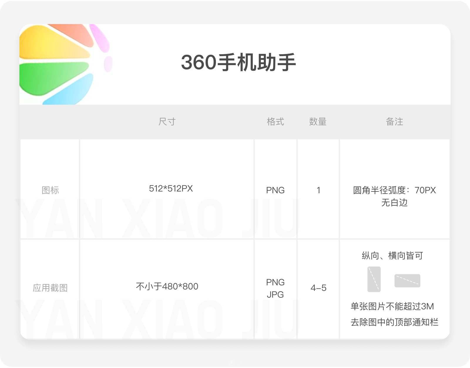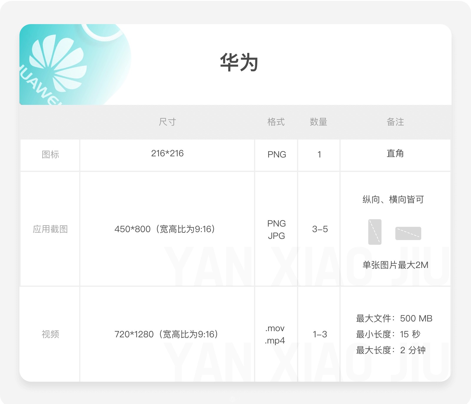 應(yīng)用截圖:最小 320 像素,最大 3840 像素,JPG/PNG 格式,圖片比例 2:1,至少需要4個圖片,最多可上傳8個,需使用不帶品牌信息的手機(jī)。