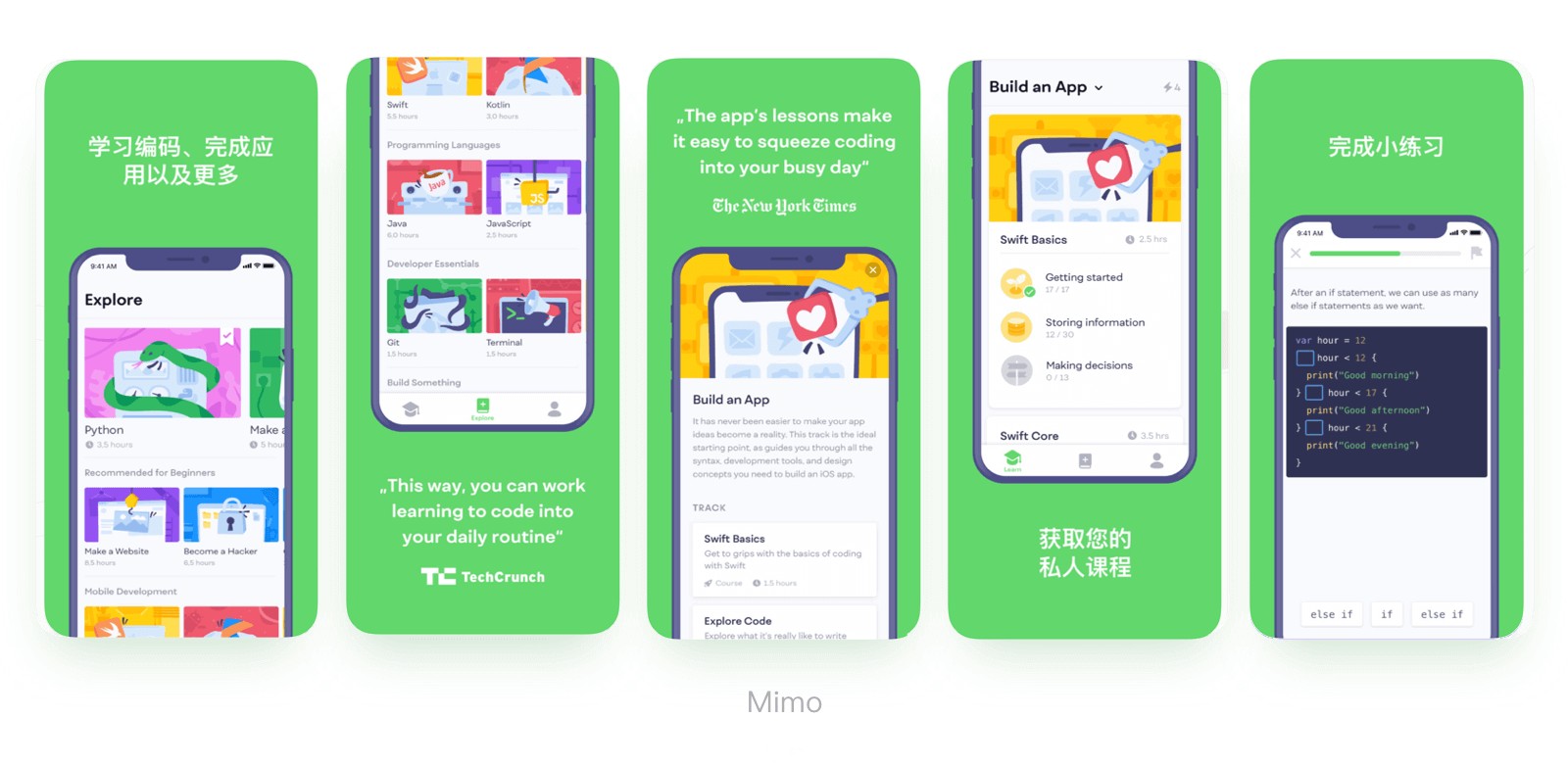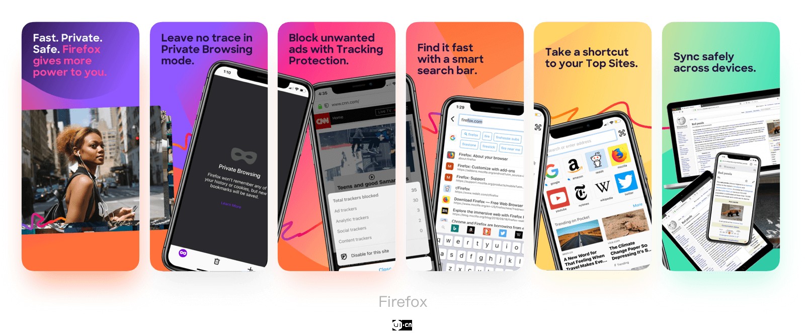 比如Mimo,同樣是截圖+文案+手機(jī)框的元素,但因為調(diào)整了手機(jī)的位置,上下穿插的變化讓畫面更加活潑。Firefox讓手機(jī)的連續(xù)跨屏結(jié)合背景的色彩漸變,使界面更加活力時尚。
