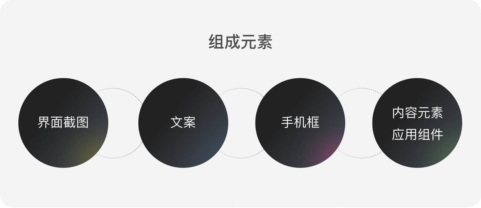 市場圖的組成元素主要有界面截圖、文案、手機(jī)框、內(nèi)容元素和應(yīng)用組件。