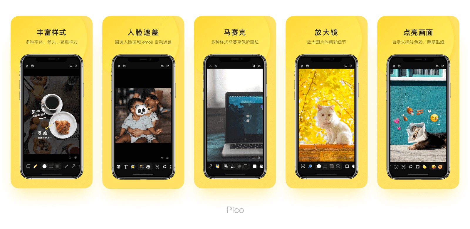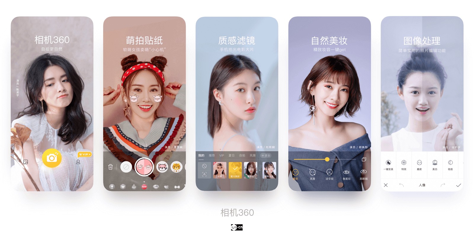 展現(xiàn)產(chǎn)品的亮點、價值、核心功能或是本次更新改版的特性等,主要是讓用戶快速得到有價值的信息,了解產(chǎn)品的功能特性,區(qū)別于競品。一般工具型產(chǎn)品都傾向于選擇這樣的內(nèi)容。如360相機(jī),5張圖分別展示了產(chǎn)品的5種功能。