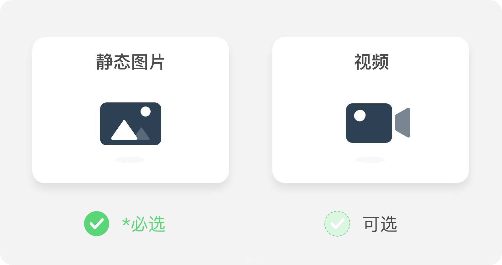 市場圖支持靜態(tài)圖片和視頻兩種形式。靜態(tài)圖是必須提供的,視頻是可選項,可做可不做。視頻雖然展示直觀表現(xiàn)力強(qiáng),但耗時也會多一些,具體我們需要根據(jù)項目的時間和內(nèi)容來評估。