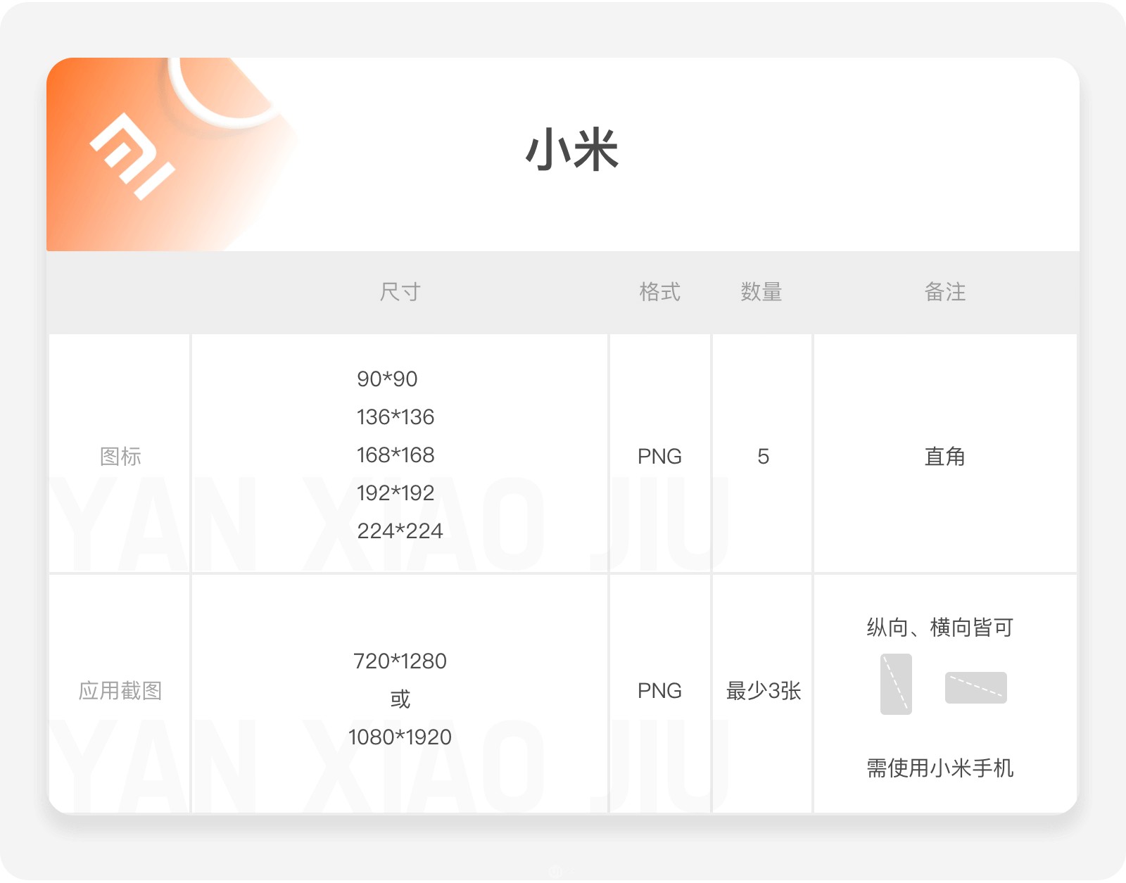 應(yīng)用截圖:需上傳至少 3 張圖片,尺寸可選720*1280 或 1080*1920,支持橫屏或豎屏。需要注意的是,要求使用小米手機(jī)外觀。