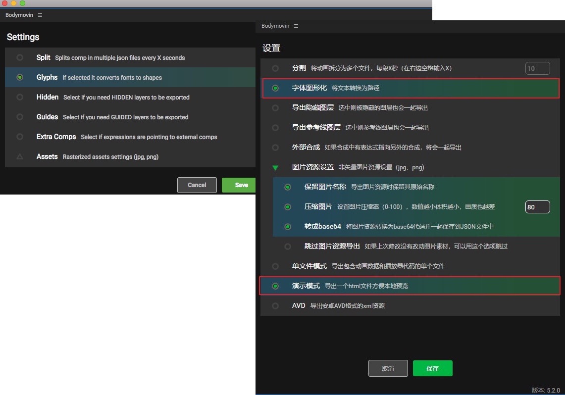每次導(dǎo)出時(shí)都需要進(jìn)行設(shè)置。標(biāo)紅區(qū)域?yàn)楸剡x選項(xiàng)。字體圖形化可以將字體轉(zhuǎn)化為路徑,不勾選會(huì)因?yàn)閼?yīng)用的平臺(tái)沒有相應(yīng)字體導(dǎo)致文字加載出錯(cuò);勾選演示模式后會(huì)生成 html 文件,打開該文件即可預(yù)覽動(dòng)效。