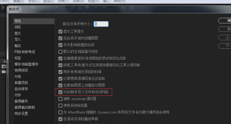 Mac:轉(zhuǎn)到Adobe After Effects>首選項(xiàng)>常規(guī)>并選中「允許腳本寫入文件和訪問網(wǎng)絡(luò)」。