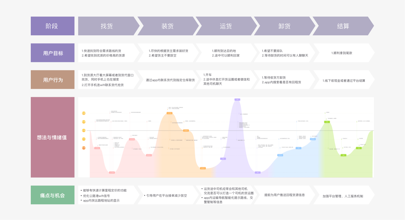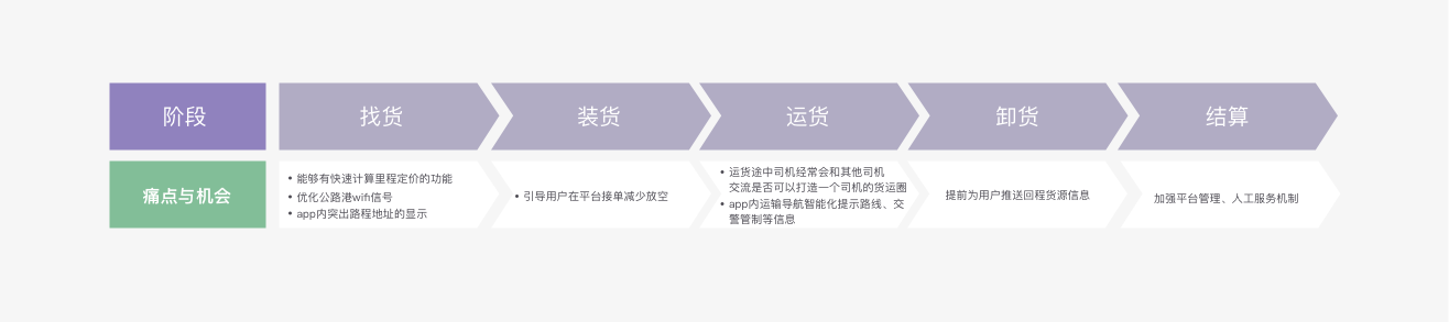首先我們先將用戶的一個核心完整的流程進行階段劃分:找貨-裝貨-運貨-卸貨-結算。在每一個階段下找到用戶目標