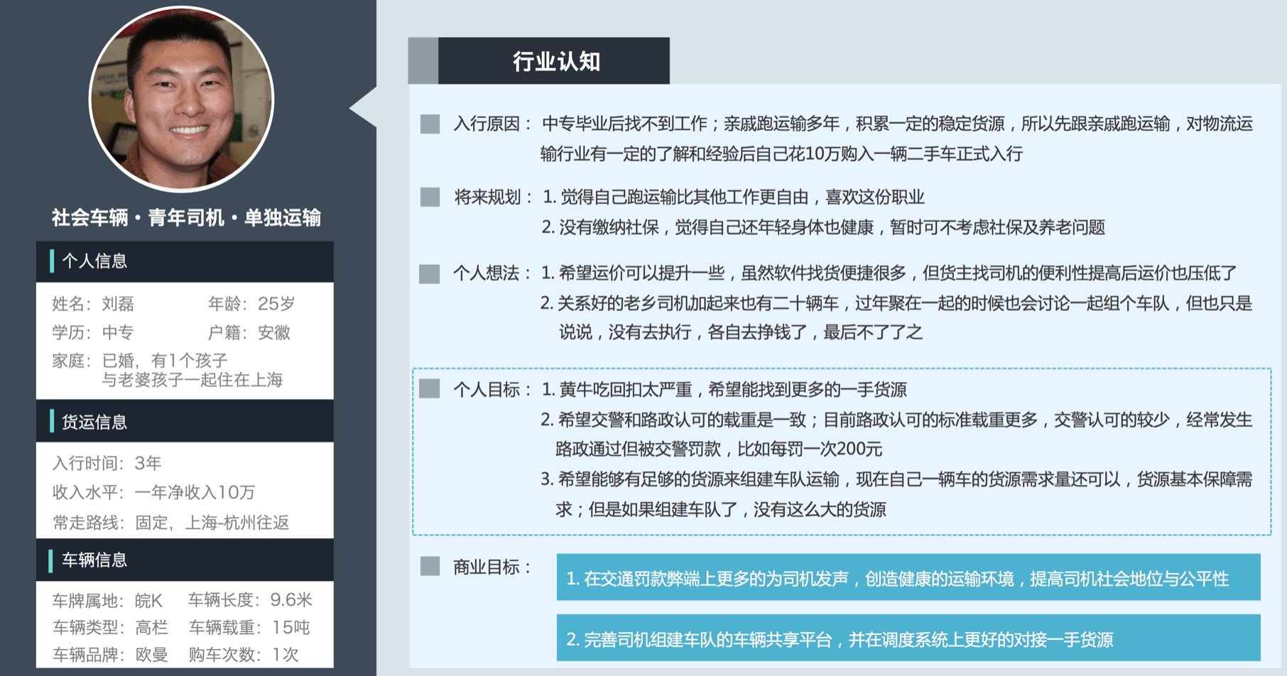 挖掘用戶深層次的挖掘,很多問題即便用戶描述出來也是表象的。在訪談之前我們也想看一看驗證一下是否用戶會覺得我們的文本不夠大,很多用戶反饋字太小。但是在實際過程中,用戶并沒有瞇眼或者很近的看屏幕,一個是他們本身就把手機文字調成了最大,另外司機要是視力不好也是開不了車的,但是為什么他們會說文字小,原來是因為信息過于密集,讓他們覺得信息獲取的效率不高,而不是真的因為文字小。