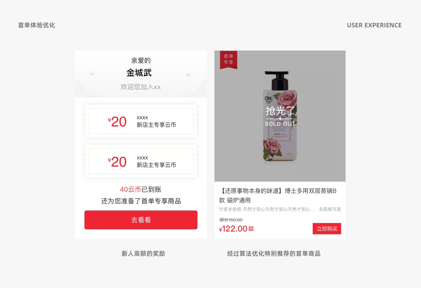 第二,缺少引導。所以在優(yōu)化后我們分別給了用戶兩個選擇,一個是選擇對應的會場使用,另一個就是逛主會場??傊阋嬖V用戶他可以去哪里,該去哪里,而不要讓用戶發(fā)呆。所以通過這樣一次交互和視覺層面的優(yōu)化,解決了這次燃眉之急,數(shù)據(jù)也有了大幅的回升,這就是體驗設計師要時刻關注的。