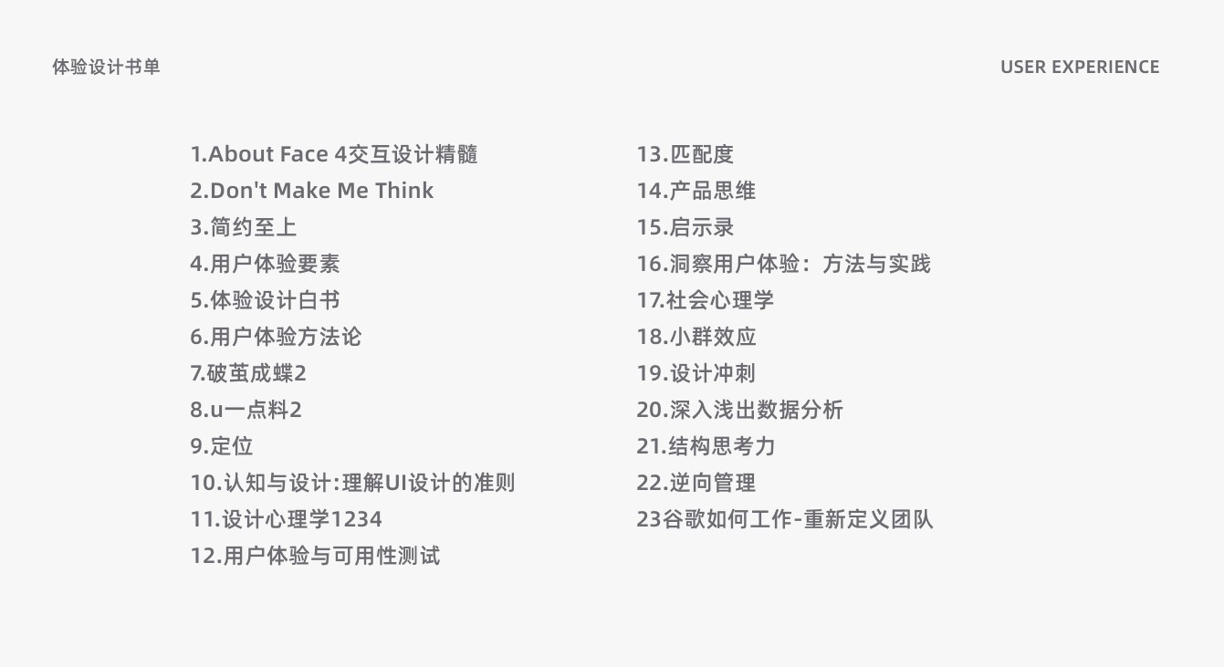 另外你還可以把市面上相關體驗設計UE的書都去看一看,選擇一些細讀,因為沒有任何一本書,任何一種方法論可以涵蓋所以,也不能將你變成大師,我們能做的就是除了項目積累外,自己平時的沉淀。方法論不是亂用,是需要以商業(yè)價值用戶價值為目標的所以形成你自己的方法論,不需要很全。