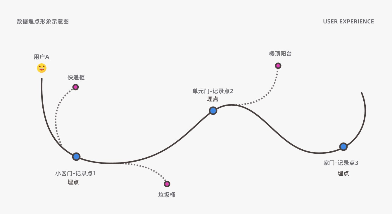 舉個例子,你從小區(qū)走到家里,會遇到3扇門:小區(qū)門、單元門、家門,那么埋點的意思就是在這三扇門的地方我裝了3個監(jiān)控,意思就是我可以記錄并且看到你到底進了哪扇門,一共進了幾扇。當然埋點可以埋的地方很多,你可以在垃圾堆邊埋一個,看看用戶從單元門走出后為什么沒有出小區(qū),就可能因為你在垃圾堆邊的監(jiān)控看到原來他去倒垃圾了。