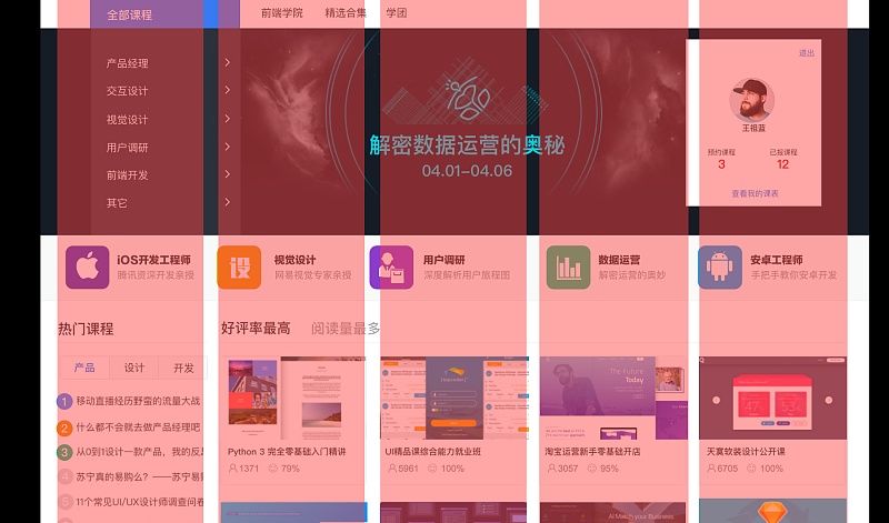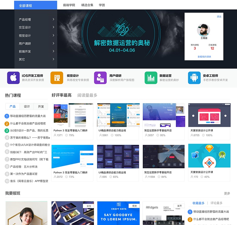 很多需求方希望傳遞很多內(nèi)容信息,并且每一個都是重點,最后就會導(dǎo)致用戶根本不知道看什么,我們的這個網(wǎng)站就存在這個問題,重點應(yīng)該是課程的導(dǎo)航,然而個人信息和快捷入口的圖標區(qū)已經(jīng)完全搶走的我們的視線。