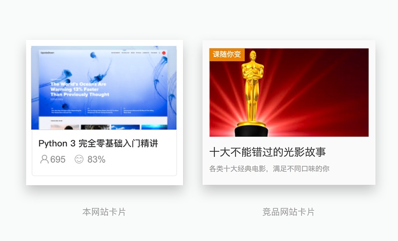 仔細觀察,我們的卡片,標題與輔助信息視覺層級很接近,幾乎看不出主次,而競品的卡片,標題與輔助信息對比很強烈,很容易就知道要突出標題。