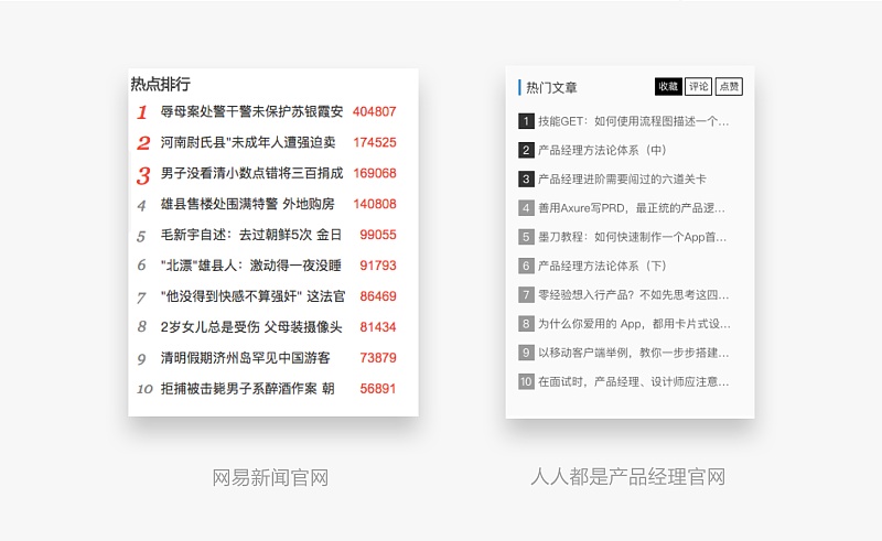 我們會發(fā)現(xiàn)競品的卡片前三名序號顏色都是統(tǒng)一的(當然有些網(wǎng)站也不是這樣的),雖然網(wǎng)易新聞官網(wǎng)的卡片用了紅色,但是為了避免過于刺眼,它沒有用色塊的形式,而是僅僅使數(shù)字加大變紅。