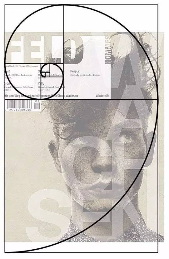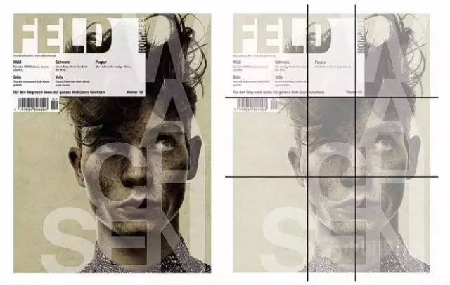 Feld雜志的設計,也參考了黃金比例三分法,左上方的標題和內容區(qū)塊明顯是參考分割線來設計的,而右下方的背景中的人物的鼻子,也就是人物的中心點正好壓在右下方的交點上。