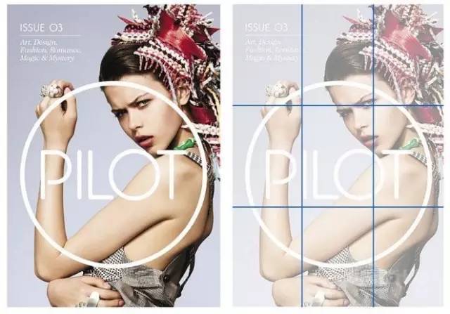 Jason Mildren 為Pilot 雜志設計封面,其中的布局采用的是均勻三分法(1:1:1)來構建視覺重心,圖中模特的眼、拇指和手臂軸心都處在視覺重心上,人物位置靠右下,留白靠左上,又是一個平衡的布局。