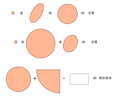 以稍微復(fù)雜一些的身體為例,它其實是由很多的圓形,橢圓形疊加而成。